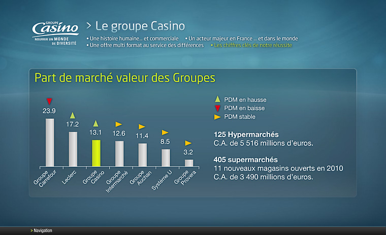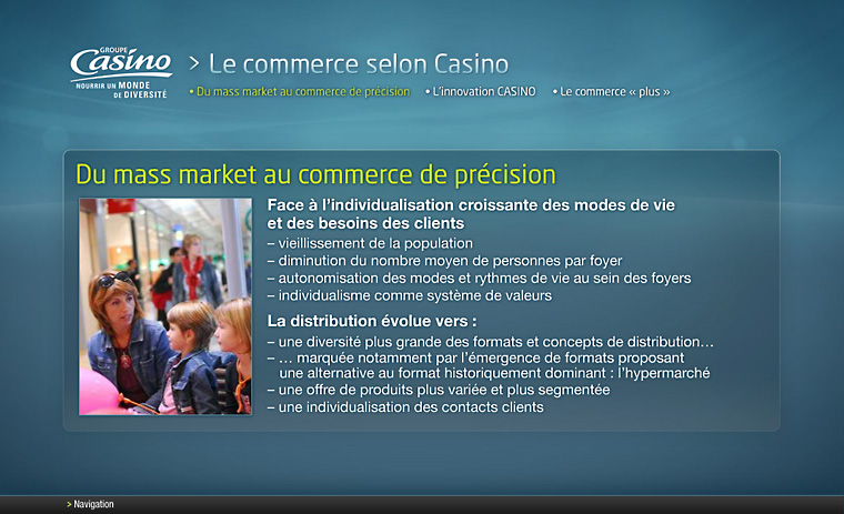 Création d'une application multimédia pour la franchise CASINO. Cette application est à destination des futurs candidats souhaitant développer une activité commerciale en exploitant l’image et le savoir faire marketing du groupe CASINO.