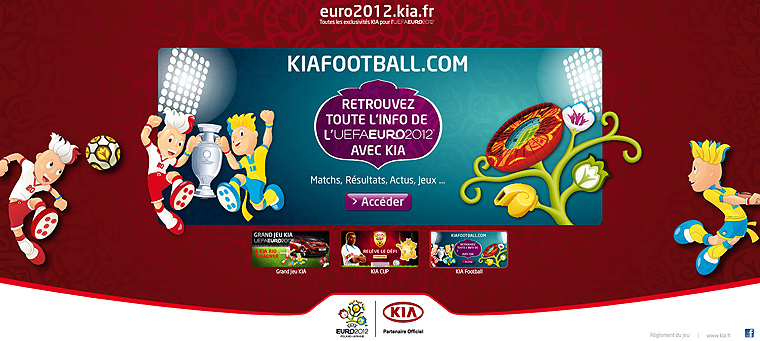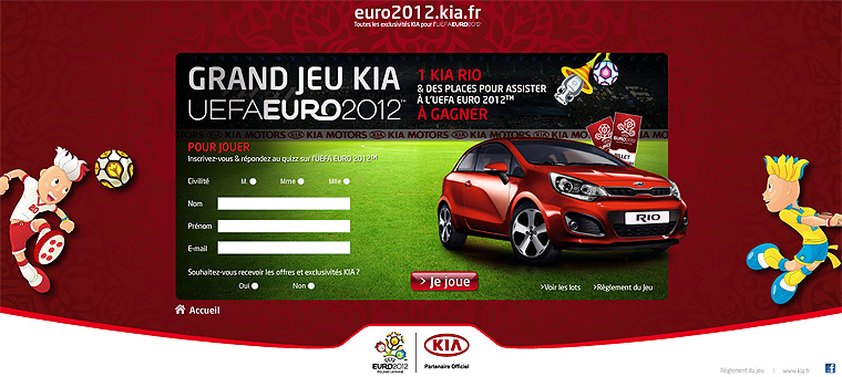 Venez découvrir le nouveau grand Jeu concours KIA Euro 2012. Participez au jeu et gagnez une KIA Rio ou des voyages pour assister à l'Euro 2012 !